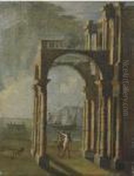 Portico Con Astanti Presso Una Marina; E Astanti Presso L'ingressodi Una Chiesa E Marina In Lontananza