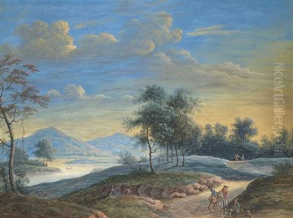 Weite Flusslandschaft Im Abendlicht Mit Staffagefiguren Auf Einem Sandigen Fahrweg