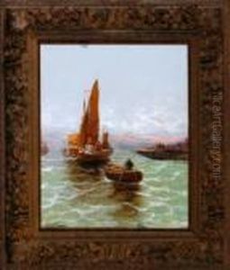 "ausfahrende Fischerboote". Sign. Ol Auf Lwd. Besch., Rest. 69 X 55 Cm. Rahmen. Abbildung Seite