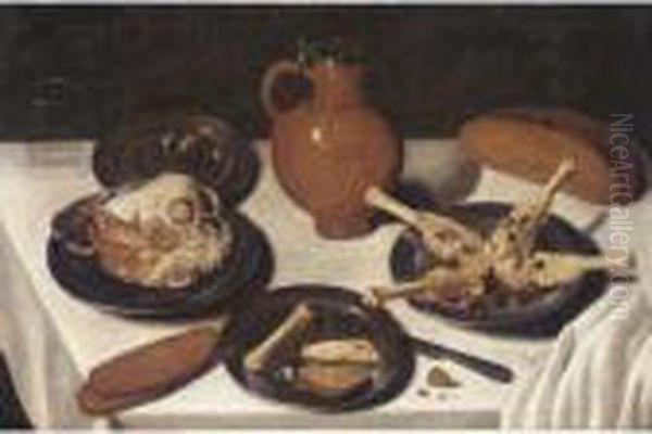 A Still Life With Various Cuts Of Meats On Pewter Plates Together With An Earthenware Flagon, A Glass And A Loaf Of Bread