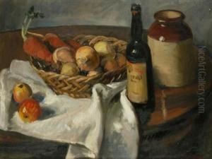 Artichokes and peas in the pod in a basket, a joint of pork, grapes, onions and cucumbers on a platter, a roemer and a crayfish on a pewter dish