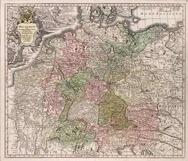 Teilkolorierte Radierung, Augsburg, Nach 1731, Bezeichnet: "postarum Seu Cursorum Publicorum Diverticula Et Mansiones Per Germaniam ... M. Seutteri S. M. C. Geogr. Aug. Vind.", Ca. 49 X 57 Cm, Gute Erhaltung