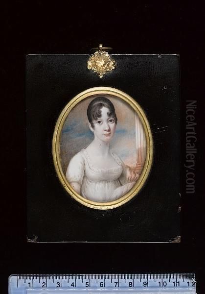 A Lady, Wearing White Dress With Frilled Trim And Ribbon Waistband, Pink Shawl Over Her Left Arm, Her Hair Parted In Curls At The Front, Pillar Background.