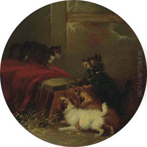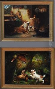 Two Terriers Chasing A Mouse Whilst A Cat Looks On; And Two Terriers Chasing A Cat (a Pair)