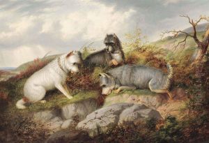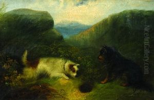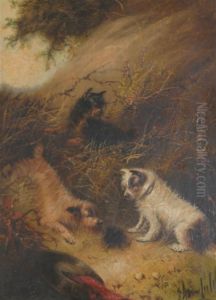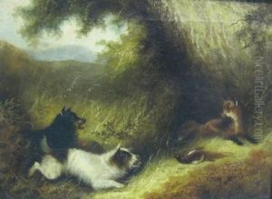 Two Dogs Resting By Their Master's Lunch Basket; Also A Companion Painting Of Three Terriers Chasing A Rabbit Down A Hole (a Pair)