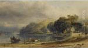 Figures In A Rocky Cove, A Castle Beyond, Possibly Tenby