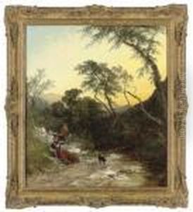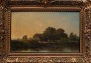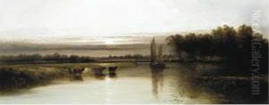 A River Scene With Figures Fishing In A Skiffin The Foreground