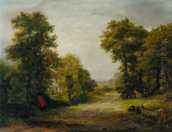 A Gypsy Encampment By A Cottage In A Wooded Landscape