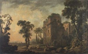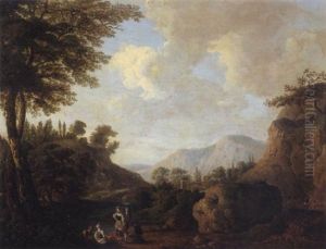 An Italianate Wooded River Landscape With Figures In The Foreground And A Village Beyond