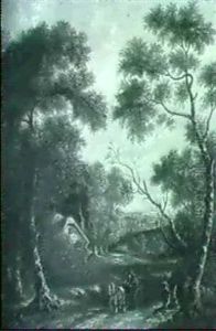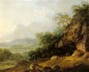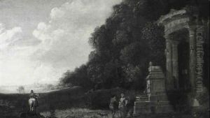 Wooded Landscape With Figures By A Lake And A Distant Towm