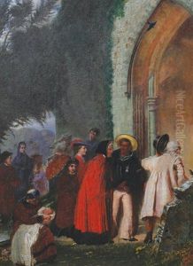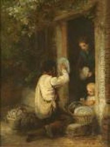 A Monk Being Presented With A Basket Of Flowers By Two Young Girls