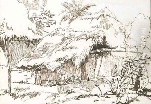 Indian figures and cattle outside a hut