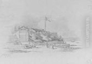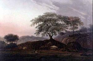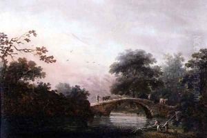 Indian Figures By A Hut With Cattle And A Bridge Nearby
