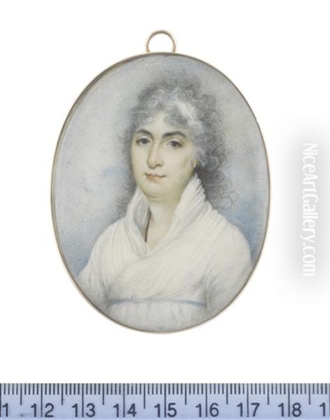 A Lady, Called Miss Fletcher, Wearing White Dress, Narrow Sky Blue Ribbon Waistband, A Black Cord Suspended From Her Neck, Her Powdered Hair Partially Upswept And Dressed With A White Bandeau