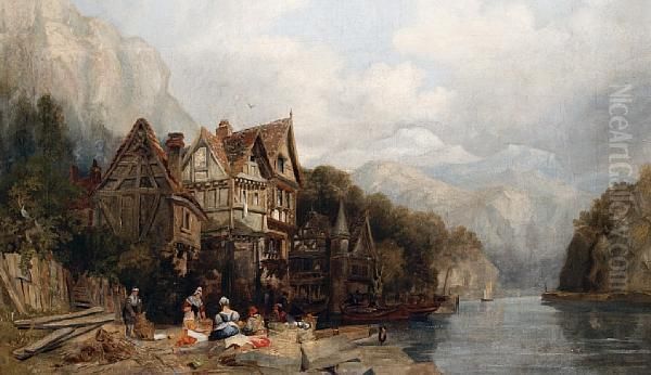 A River Landscape With Figures Mending Nets Inthe Foreground
