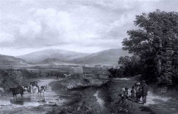 Figures On Path Near Watering Cattle In Extensive Landscape
