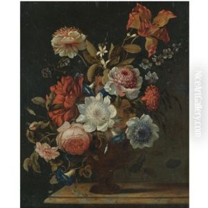 Still Life Of Apples, Plums, Raspberries And Grapes On A Ledge