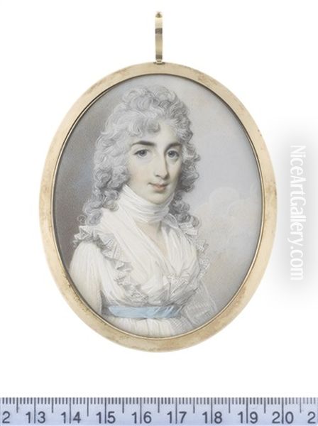 A Lady, Wearing White Dress With Frilled Trim, White Fichu And Neck Scarf, A Sky Blue Sash At Her Waist, Her Powdered Wig Worn A La Conseilleur