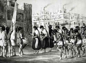 The ceremony of Ongi, or Pressing Noses: Natives greeting each other, with Mount Egmont in the distance from the 'New Zealand Illustrated'