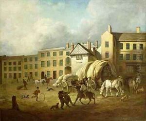 18th Century Town Scene with Figures and Horses in a Yard
