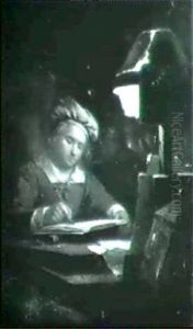 An Artist Showing Designs To A Client In A Candle-lit Tavern