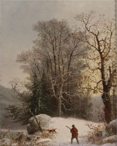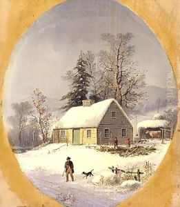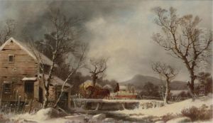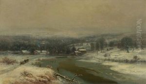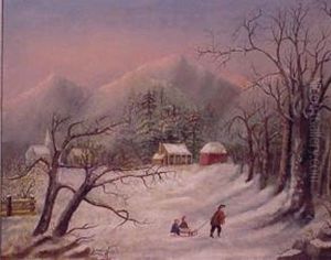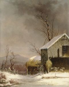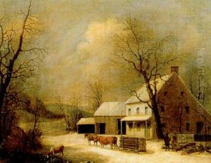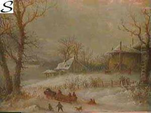 Winter Landscape With Figures Working Around Stone Home, Barn And Outbuilding