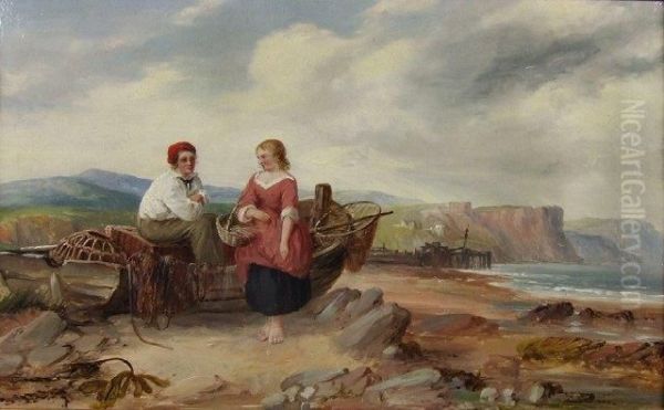 Beach Scene With Young Fisherfolk By Afishing Boat With Cliffs To Background