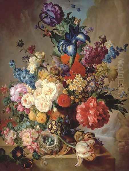 Bring the timeless beauty of George Jacobus Johannes Van Os's Roses, peonies, irises, hollyhocks, narcissi, blazing star, primulas, marigolds and other flowers with a Five-spot burnet moth in a vase into your home with a handmade oil painting reproduction. Carefully recreated on canvas by skilled artists using traditional techniques, this piece captures the delicate brushwork, subtle light, and vibrant color of the original masterpiece. With museum-level quality and rich texture, it brings elegance and artistic depth to any space. Enjoy free shipping and make this masterpiece a part of your personal collection.