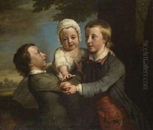 Portrait Of A Boy Wearing A Green Coat And Breeches With Red Hose, Blowing Bubbles With His Two Sisters Dressed In Green