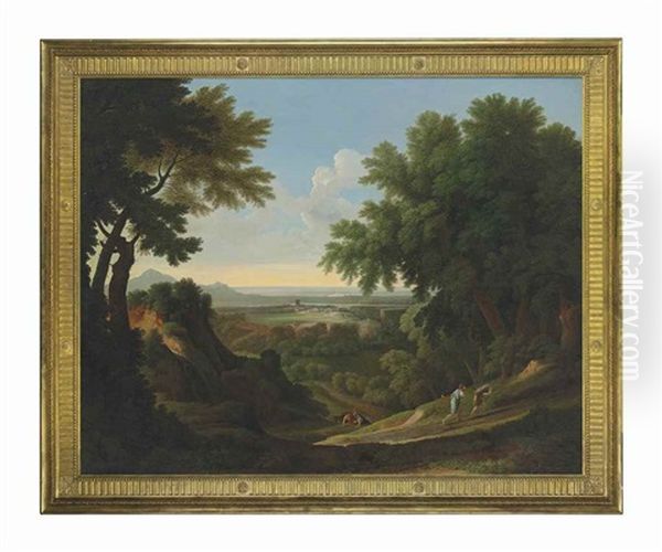 An Extensive Arcadian Landscape With Figures On A Path, A Town Beyond