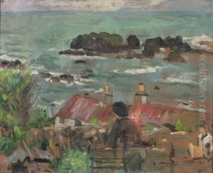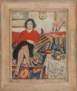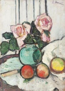 Anemones In A Red Pottery Vase With A Wine Glass And Apples On A Plate