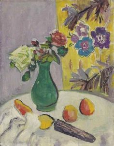 Yellow Roses In A Vase With Mixed Fruit On A Draped Table