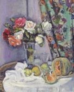Still Life Of Pink Roses, Fruit, Glass And Fabrics