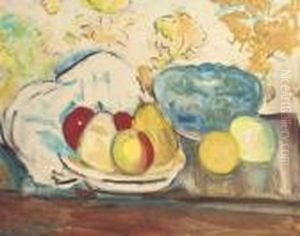 A Still Life Of Fruit, Bread And Black Bottle On A Tabletop