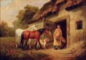 Horses Watering By A Woodland Farmstead