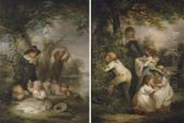 Children Fishing; And Children Gathering Nuts