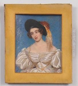 "portrait Of A Lady", Half Length In White Gown, Black Feathered Hat And Long Gold Necklace