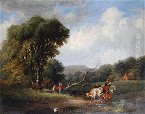 Figures And Cattle Resting Beside A Pond