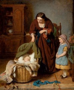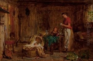 Interieur Mit Mutter Bei Der Naharbeit, Kleinem Madchen Und Kind In Der Wiege
