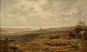 Rural Landscape With Sheep And Shepherd On A Path With A Stile And Cottages