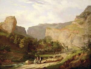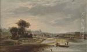Shepherd Approaching A Ford,farm Buildings, An Open Landscape And Windmill Beyond