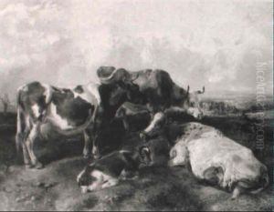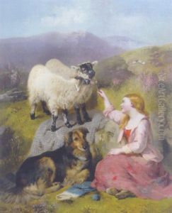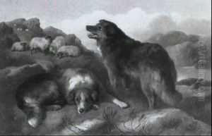Drei Schafe Und Ein Hirtenhund In Hugeliger Landschaft