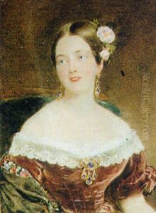 Portrait Of A Lady In A Blue Dress With White Lace Sleeves And Trimming, Holding A Pink Rose In Each Hand