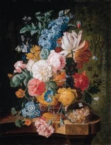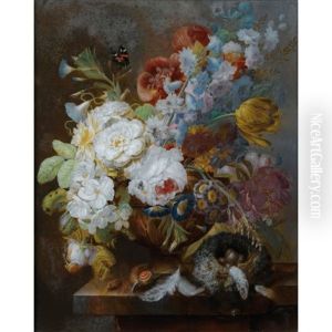 Still Life Of Flowers In A Glass Vase And Urn, And A Bird's Nest