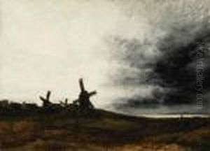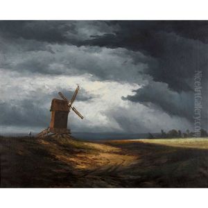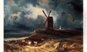 Paysan Conduisant Une Charrue Dans Un Paysage Avec Moulin.