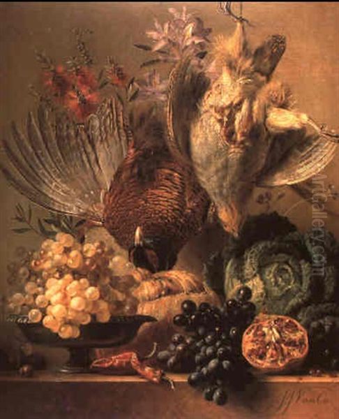 Dead Pheasant, Partridge, Grapes, Cabbage, Fruit And Flowers On A Ledge