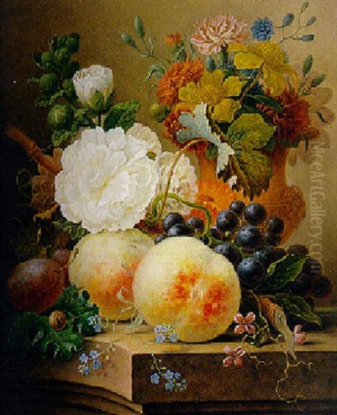 Nature Morte Au Bouquet De Fleurs Et Fruits Poses Sur Un Entablement