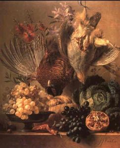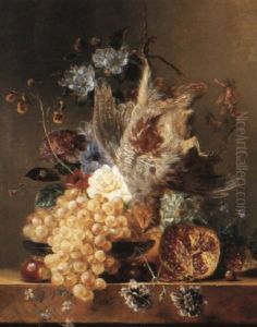 A Pheasant, A Partridge With Grapes, A Cabbage And Fruit And Flowers On A Ledge