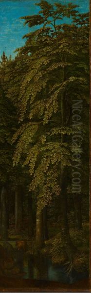 Buitenzijde van de rechtervleugel van een drieluik met een bosgezicht
