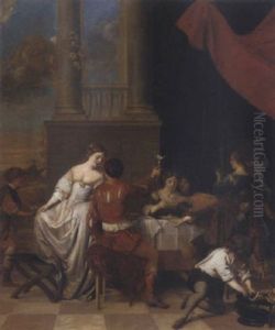 An Elegant Company Courting And Making Music In An Interior, With A Servant Pouring Wine In The Background And Two Dogs In The Foreground